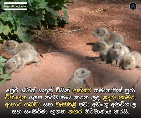 අක්කර ගාණක් පුරාවට විහිදිලා තියෙන, වෙනම නිදන කාමර, ළදරු කාමර සහ නානකාමර පවා තියෙන යෝධ භූගත නගරයක් ගැන හිතලා බලන්න. මේ අරුම පුදුම නගරය හදන්නේ “ප්රේරී ඩෝග්” (Prairie dog) කියන හරිම හුරතල් පුංචි සත්තු ජාතියක්. මුළු සත්ව ලෝකයේම ඉන්න දක්ෂතම ඉංජිනේරුවන් අතරින් මුල් තැනක් මේ සතුන්ට හිමි වෙනවා!