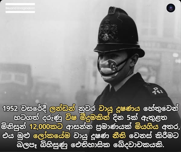 තමන්ගේ කකුලවත් පේන්නේ නැති, අහසින් කුරුල්ලෝ බිමට වැටෙන, කැලේ ඉන්න සත්තු පවා හුස්මගන්න බැරුව මැරිලා යන තරමේ විෂ මීදුමකින් මුළු නගරයක්ම වැහිලා ගියොත් කොහොමද? 1952 දෙසැම්බර් මාසයේ එංගලන්තයේ ලන්ඩන් නුවරට මේ බියකරු අත්දැකීමට මුහුණ දෙන්න සිද්ධ වුණා. මේ අවාසනාවන්ත සිදුවීම ඉතිහාසයේ හැඳින්වෙන්නේ “The Great Smog of London” කියලයි.