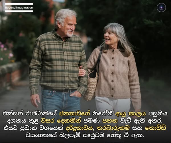 මේක එක්සත් රාජධානියට විතරක් තියෙන ප්රශ්නයක් නෙවෙයි. ලෝකයේම නිරෝගී ආයු කාලය 2019 වෙනකන් වර්ධනය වුණත්, කොවිඩ් වසංගතය නිසා ඒ දියුණුව ආයෙත් 2012 තිබුණු තත්ත්වයටම කඩාගෙන වැටුණා. ඇමරිකාවෙත් (US) මත්ද්රව්ය ප්රශ්න සහ වසංගත තත්ත්වයන් නිසා මිනිස්සුන්ගේ නිරෝගී කාලය විශාල වශයෙන් අඩුවෙලා තියෙනවා. මිනිස්සුන්ගේ ආයුෂ වැඩි වුණාට, නිරෝගීව ඉන්න කාලය අඩුවෙමින් පවතින බව මේ දත්තවලින් අපිට පැහැදිලි වෙනවා.