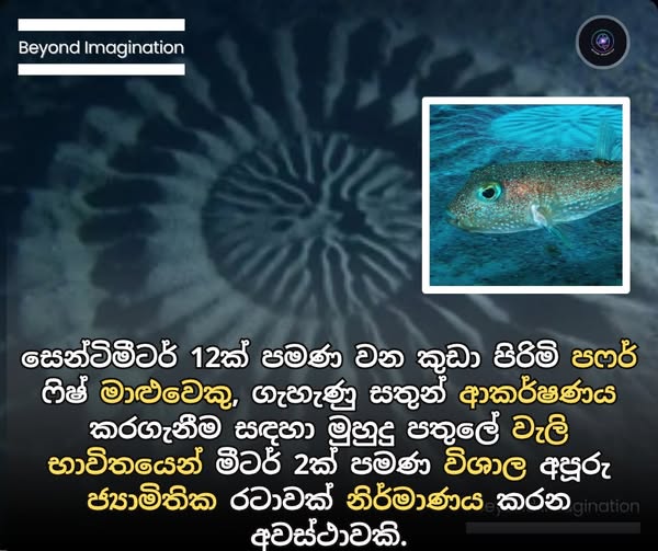 ජපානයට ආසන්න මුහුදු පතුලේ තියෙන මීටර් 2ක් විතර විශාල, අද්භූත ජ්‍යාමිතික රටා (Crop circles) දැක්කම මුලින්ම ගොඩක් අය හිතුවේ මේවා පිටසක්වල ජීවීන්ගේ වැඩක් කියලයි. හැබැයි 1995 අවුරුද්දේ විද්‍යාඥයන් හොයාගත්තා මේක පිටසක්වල ජීවීන්ගේ වැඩක් නෙවෙයි, සෙන්ටිමීටර් 12ක් විතර දිග පිරිමි “පෆර් ෆිෂ්” (Pufferfish) කියන පුංචි මාළුවෙක්ගේ වැඩක් කියලා!