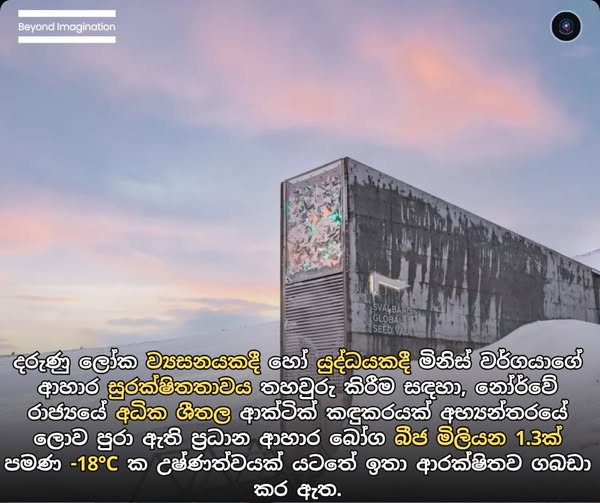 ලෝක විනාශයක්, දරුණු යුද්ධයක් හරි ස්වභාවික ව්යසනයක් නිසා ලෝකයේ තියෙන කෘෂිකර්මාන්තය සම්පූර්ණයෙන්ම විනාශ වෙලා ගියොත් අපි මොකද කරන්නේ? මේ ප්රශ්නයට උත්තරයක් විදිහට නෝර්වේ (Norway) රාජ්යයේ අධික ශීතල ආක්ටික් කඳුකරයක් අභ්යන්තරයේ ලෝකයේ තියෙන වටිනාම බැංකුවක් නිර්මාණය කරලා තියෙනවා. ඒ තමයි “සෝල්බාර්ඩ් ගෝලීය බීජ බැංකුව” (Svalbard Global Seed Vault).
