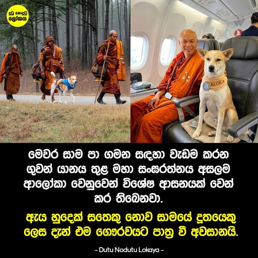 පූජ්ය පඤ්ඤාකර ස්වාමීන් වහන්සේ ප්රමුඛ මහා සංඝරත්නය විසින් මෙහෙයවනු ලබන මෙම සාම පා ගමන සඳහා වැඩම කරන ගුවන් යානය තුළ මහා සංඝරත්නය අසලම ආලෝකා වෙනුවෙන් විශේෂ ආසනයක් වෙන් කර තිබීම සුවිශේෂී දසුනක්. ඇය හුදෙක් සතෙකු නොව සාමයේ දූතයෙකු ලෙස දැන් එම ගෞරවයට පාත්ර වී අවසානයි.